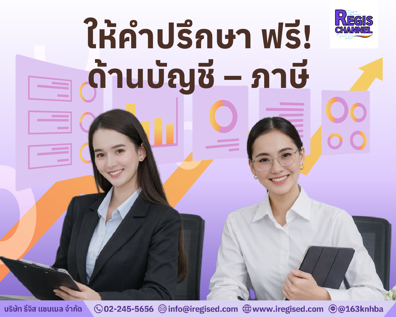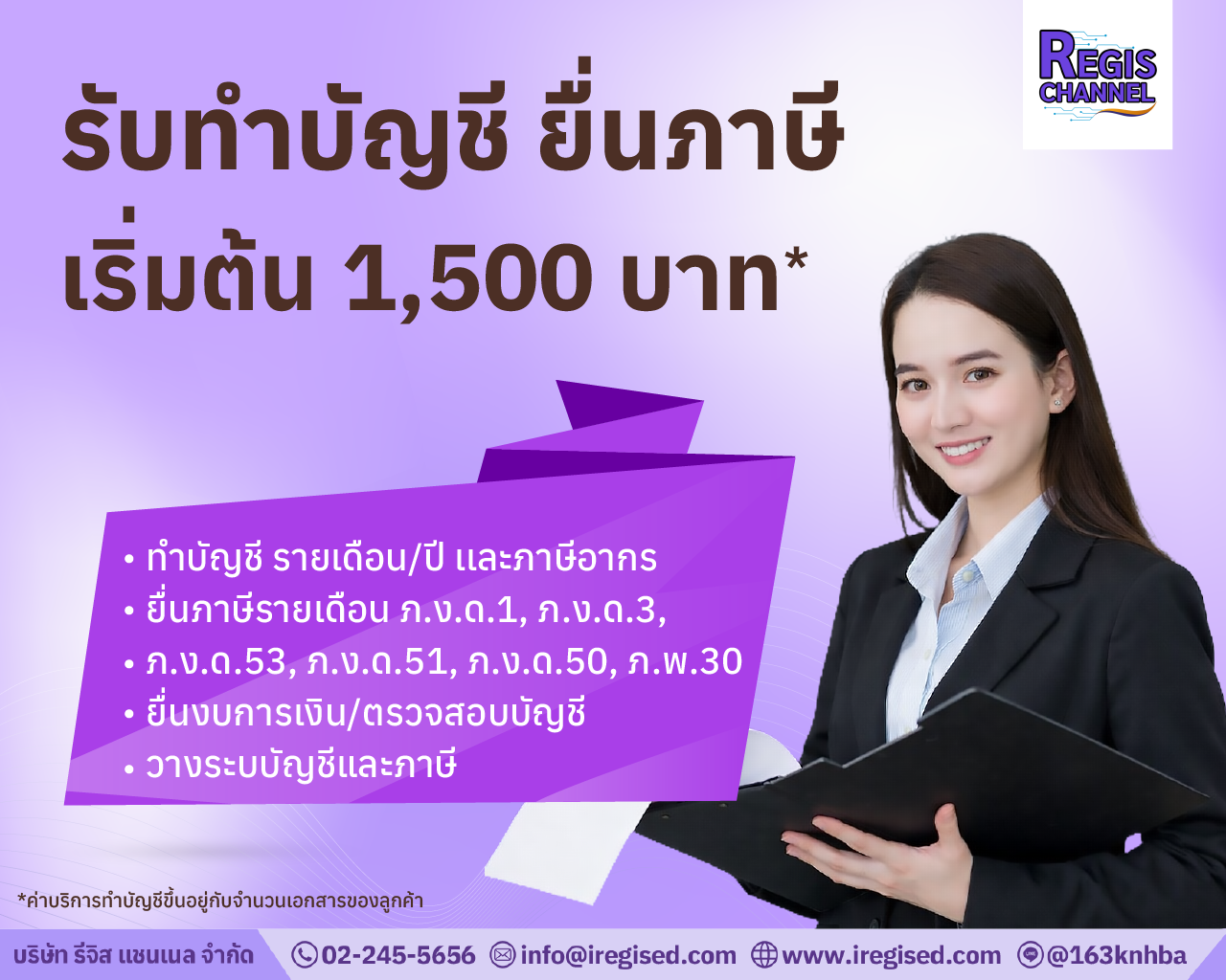 Regis Channel คือ สำนักงานบัญชีและบริษัทรับทำบัญชี ที่ก่อตั้งขึ้นจากความตั้งใจแก้ปัญหาที่เจ้าของธุรกิจพบเจออยู่เสมอ ไม่ว่าจะเป็นการสื่อสารที่เข้าใจยาก หรือความกังวลเรื่องภาษี